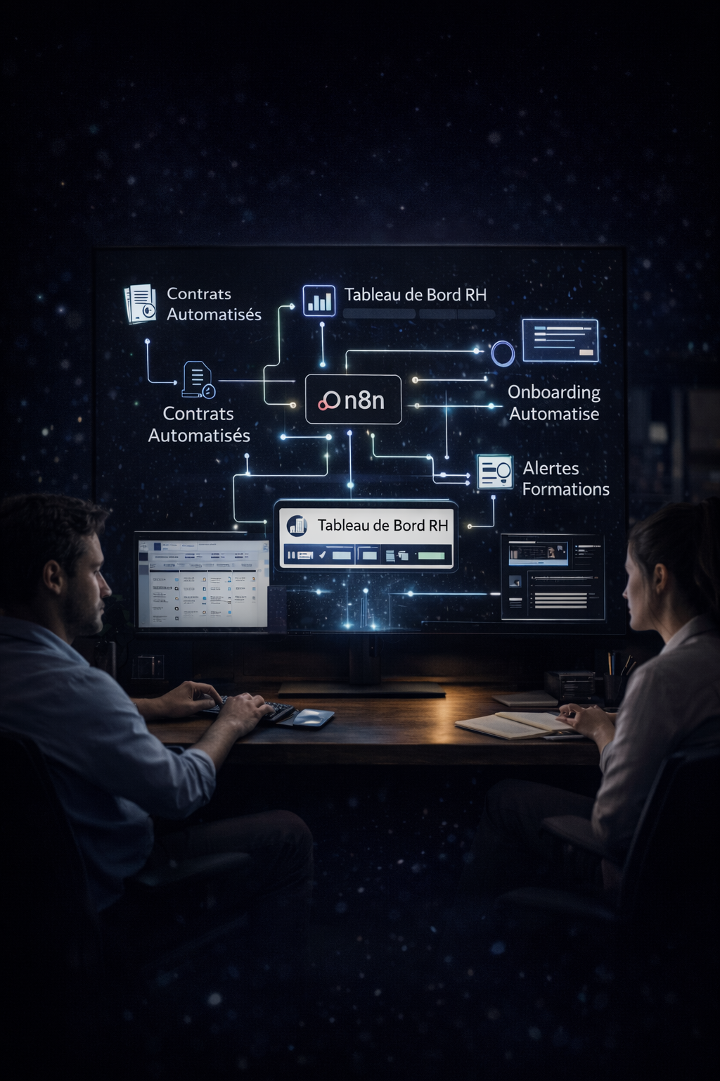 Diwai a déployé un système d'automation RH complet avec n8n : génération automatique des contrats depuis un formulaire standardisé, workflow d'onboarding unifié sur 12 sites, alertes automatiques pour les formations arrivant à échéance, tableau de bord centralisé. En 8 semaines : 180 contrats générés sans manipulation manuelle, onboarding réduit de 3 jours à 4 heures, zéro non-conformité formation sur l'exercice suivant.